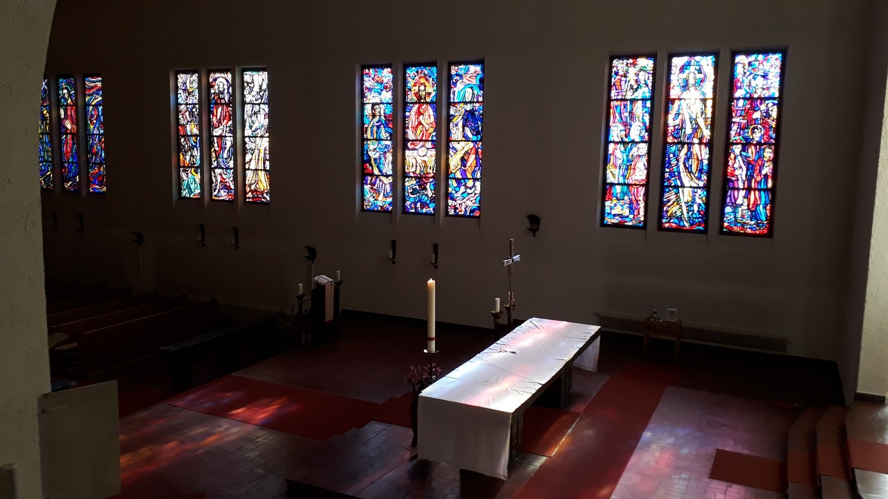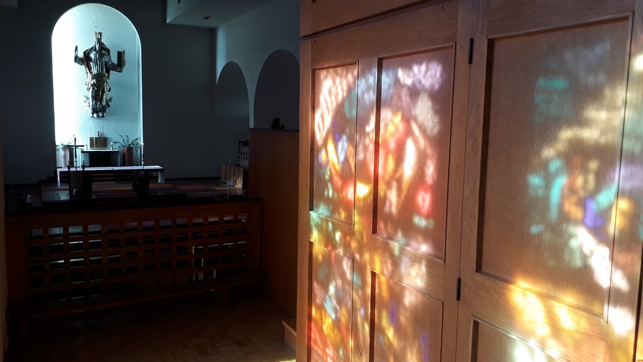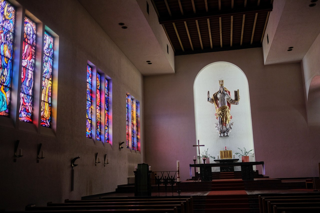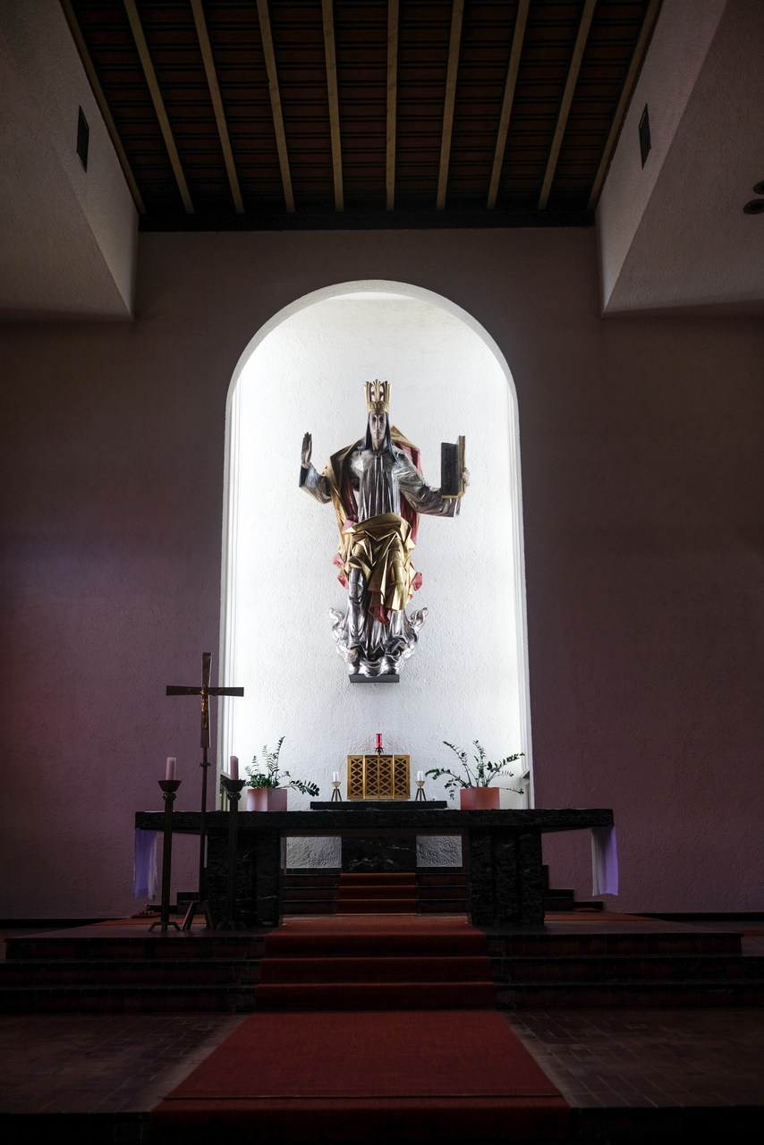 Die Seminarkirche zum Mittler und Guten Hirten ist ein hoher, langer Saalraum, der den Blick von allen Seiten freigibt auf die mächtige Mensa des Hauptaltares, auf den dahinter, etwas erhöht stehenden Sakramentsaltar wie auf den in einer apsidenförmigen Ausbuchtung hängenden Christus König.